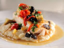 Add the olive oil to another pan over medium heat. Add the shallots and cook for 1 minute, and then stir in the artichokes, tomatoes, white wine and garlic. Cook until the wine is reduced by half, and then pour in the fish stock. Cook until the stock is reduced by half, and then add the olives, piquillo peppers, parsley and lemons. Swirl in the butter to thicken. Season with salt and black pepper.