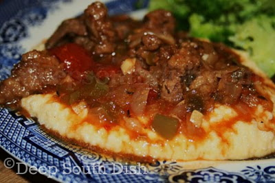 Heat 2 tablespoons of canola over medium high heat in a large iron skillet that has a lid. Slice the round steak into strips and season with the salt and pepper. Toss the meat strips in half of the flour, reserving the remaining flour, and drop the strips into the hot oil to brown. Remove and set aside.