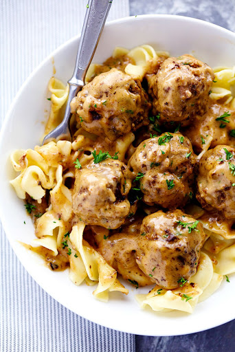 Add the meatballs back to the skillet and simmer for another 1-2 minutes. Serve over egg noodles or rice.