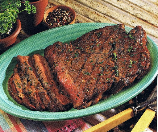 Place steak on a serving platter. Cut thin slices across the grain. Drizzle reserved butter mi9xture over steak.