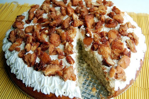 To assemble the cake, first remove sides from springform pan. Pipe or spread whipped cream over cake. Sprinkle vanilla wafer toffee on top of cake.