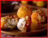 Scoop a 1 1/2 tablespoon ball of the cheese mixture into the flour and roll to coat. Transfer the ball to the eggs and roll to coat. Transfer the cheese ball to the panko and again roll to coat. Transfer the ball to the parchment-lined tray. Continue with the remaining cheese mixture.