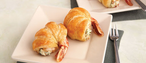 3. Unfold the pastry sheet on a lightly floured surface. Cut the pastry sheet crosswise into 18 (1/2-inch wide) strips. Starting at the top, wind 1 pastry strip around 1 shrimp, slightly overlapping the pastry and ending just before the tail. Repeat with the remaining pastry strips and shrimp. Place the pastries onto a baking sheet.