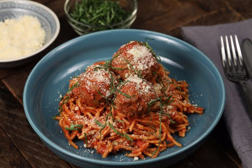 In a bowl, mix the ground beef, garlic, oregano, bread crumbs, parmesan, eggs, cream cheese, salt and pepper to taste. Roll into meatballs 2½" in diameter and gently place on top of spaghetti.