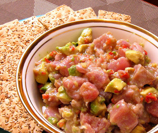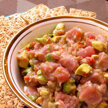 Serve tuna on a plate or in a martini glass. Garnish with crispy shallots and diced avocado.