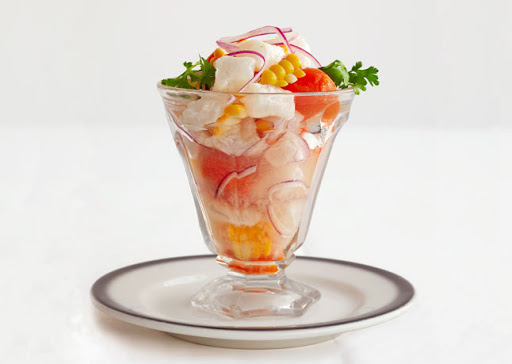 A classic Peruvian cerviche, it looks well served in a martini glass as an appetizer