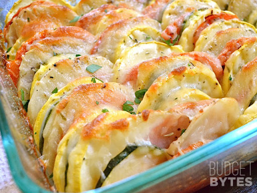 Spray the inside of an 8×8 square or round baking dish with non-stick spray. Spread the softened onion and garlic in the bottom of the dish. Place the thinly sliced vegetables in the baking dish vertically, in an alternating pattern. Sprinkle generously with salt, pepper, and thyme.