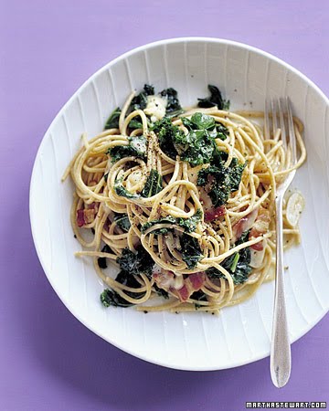 A small amount of bacon infuses this simple dish with a rich smokiness. We used whole-wheat spaghetti to balance the distinct tastes of the kale and the fontina.