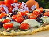 Add half of the toppings, beginning with the mozzarella, then the tomato, red onion, garlic, olives, and capers. After 2 to 4 minutes, the cheese will be melted.