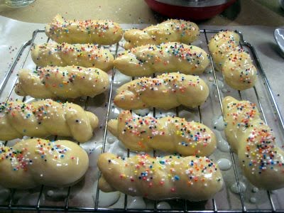 Cut dough into a strip and cut pieces from strip. Roll out with hand and shape into a wreath or braid. Do not play with dough too much when shaping.