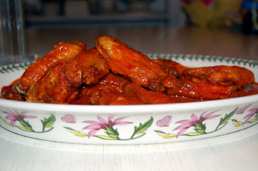 4. After wings are cooked, place them in the hot sauce and bring to boil. Let simmer for 5-10 minutes.