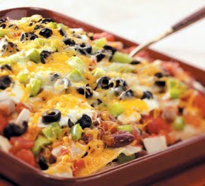 Place 6 tortillas, overlapping, in a 9 x 13 pan coated with nonstick cooking spray. Cover with 1/2 of the meat mixture. Sprinkle 1/2 cup olives on top. Pour half jar of salsa over meat mixture. Spread 1 cup sour cream over top. Repeat with tortillas, meat, olives, salsa and sour cream one more time.