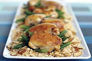 STIR rice and nuts into beans. Remove from heat; cover. Let stand 5 min.; fluff rice. Serve with chicken.
