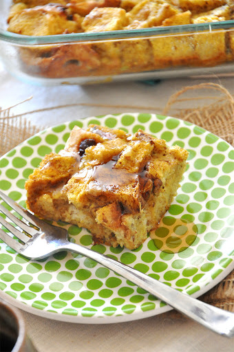 In a large bowl, whisk together eggs, milk, vanilla, pumpkin butter and pie spice until well combined. Pour over bread and push down with a spoon or your hands until it’s all soaked and mostly covered. Cover with saran wrap or lid and refrigerate overnight.