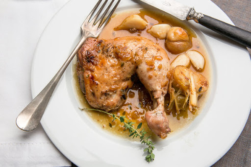 4. Serve each guest a piece of chicken and several garlic halves. Spoon pan juices over everything. Sprinkle with chopped parsley or basil if desired.