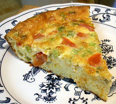 Put the cheese, chiles, tomatoes and green onions in a greased 9 1/2-10" pie plate. In a medium bowl, whisk together the eggs, cream and salt. Pour into the pie plate and mix everything just to combine. Bake at 350º 35 minutes or until the center is set. Let stand 10 minutes before serving.