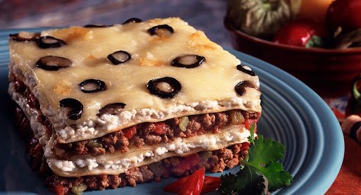 3. Place 2 tortillas in greased 13x9x2-inch baking dish, overlapping as needed. Spread 1/2 of the meat mixture over tortillas. Repeat tortilla and meat mixture layers. Top with remaining 2 tortillas. Spoon reserved sauce over top. Sprinkle with cheese.