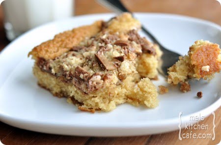 Pour the batter into the prepared pan, smoothing it to the edges. Sprinkle the top of the cake with the reserved crumbs and chopped Heath bars. Bake for 25-30 minutes until the center is no longer gooey but a toothpick inserted comes out with moist crumbs. The cake may fall slightly in the center leaving the edges raised. No fear! It will still be delicious.