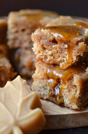 While the blondies are baking, make the maple butter glaze: Melt the butter in a small saucepan then stir in the maple syrup and brown sugar. Bring to a boil over medium heat (watch out that it doesn't boil over) and cook at a full boil for 2 minutes. Remove from the heat and let cool slightly.