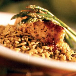 Place salmon in grill pan (or on grill) and cover; grill 3–4 minutes on each side or until 145°F (or flesh is opaque and separates easily). Serve salmon over rice. Top with raspberry sauce.