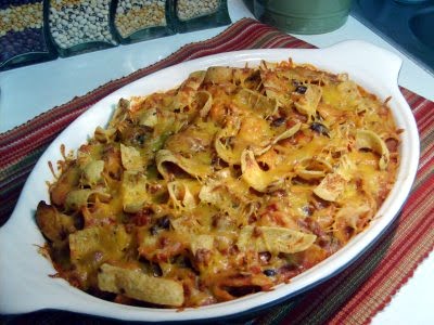 In 4 quart casserole, about 3 1/2 inches deep, layer meat mixture with beans, corn ships and cheese.