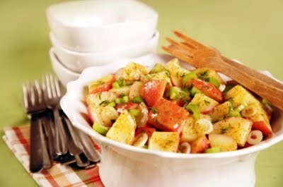 Cut the cooled potatoes into 1-inch pieces and carefully add them to the bowl, stirring until coated.