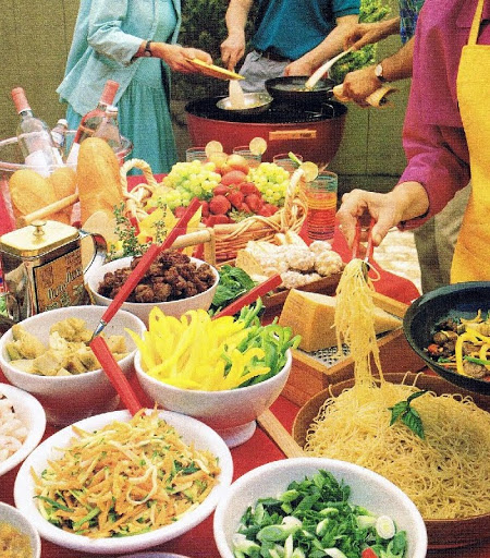 Have a barbecue with a solid bed of hot coals (you should be able to hold your hand at grill level for only 1 to 2 seconds). When charcoal briquets are almost covered with ash, scatter 10 to 15 more over coals to maintain steady heat, then add same amount every 30 minutes until you expect to cook no more than 30 minutes more. Or fire up several portable burners, such as camp stoves. Add to a frying pan, without crowding, your choice of garnishes and a little oil to moisten. Place over heat and stir often until ingredients are cooked to suit your taste. Then add a portion of spaghetti and stir until it is warm, about 2 minutes. At this point you may want to add more garnishes (ones that don't need any cooking). Then pour the pasta onto a plate, top with cheese, and eat. Wipe pan with paper towels and set aside until ready to try another combination. Makes 8 to 10 servings.