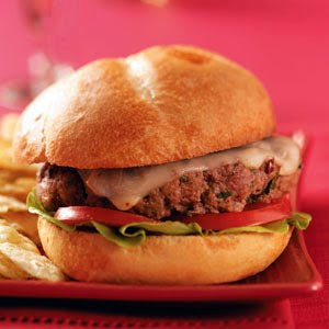Grill, covered, over medium heat or broil 4 in. from the heat for 5-7 minutes on each side or until a meat thermometer reads 160° and juices run clear. Top with cheese. Cover and cook 1-2 minutes longer or until cheese is melted. Serve on buns with lettuce and tomato if desired. Yield: 4 servings.