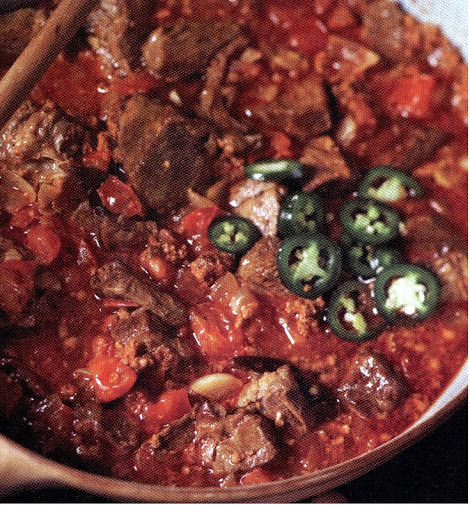 Return chorizo mixture to Dutch oven. Add 1 1/2 cups (or more, if desired) of the reserved cooking liquid, the beef, tomatoes, chile peppers, oregano, and cumin. Bring to boiling; reduce heat. Simmer, uncovered, for 15 minutes. Season to taste with salt and pepper.