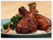 Place chicken drummers in a resealable plastic bag with the teriyaki sauce and let marinate 4 hours or overnight. Preheat oven to 400˚F. Place a cooling rack over a baking sheet and arrange chicken legs on it. Season chicken liberally with coarse black pepper. Cover chicken legs with foil and roast 20 minutes. Turn legs and roast 10 minutes more. Remove foil and roast an additional 5-8 minutes to darken and crisp. Sprinkle with sesame seeds. While the chicken cooks, bring stock and water with 1 tablespoon vegetable oil to a boil over high heat. Add rice and stir, bring back up to a boil then reduce heat and cover pot. Simmer 18 minutes then fluff with fork. While chicken roasts the last 10 minutes, bring a few inches of salted water to a boil. Add the broccolini and blanch 2-3 minutes, then drain. Heat remaining 2 tablespoons vegetable oil in a large skillet. When oil is hot, add blanched broccolini, peppers and scallions. Stir-fry 2 minutes, add garlic and ginger, and stir-fry 1 minute more. Serve chicken legs with stir-fried veggies and rice alongside.