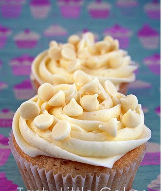 5. Dip tops of cooled cupcakes into white chocolate mixture and turn upright. Smooth tops with a butter knife if necessary. Garnish with white chocolate shavings.