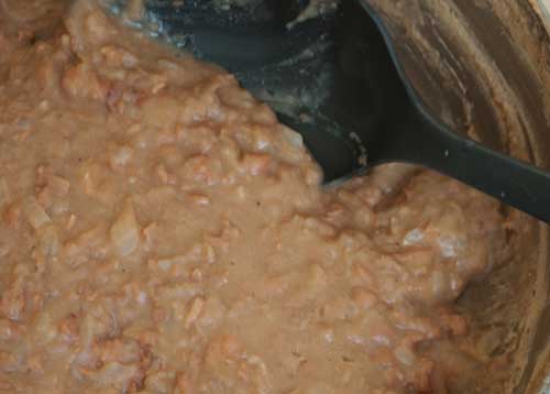 3. Reduce heat to low and mash beans well using a fork or potato masher. It will look very soupy - don't be alarmed.