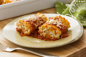 SPREAD 1/2 cup spaghetti sauce onto bottom of 13x9-inch baking dish. Spread each noodle with 3 Tbsp. cheese mixture; roll up. Place, seam-sides down, in dish. Top with remaining sauce and Parmesan; cover.