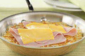 This was great!! Except ham I used roast beef slices and cut them up and cooked them into the hash browns and used shredded cheese instead of singles! It was very good!