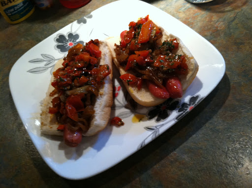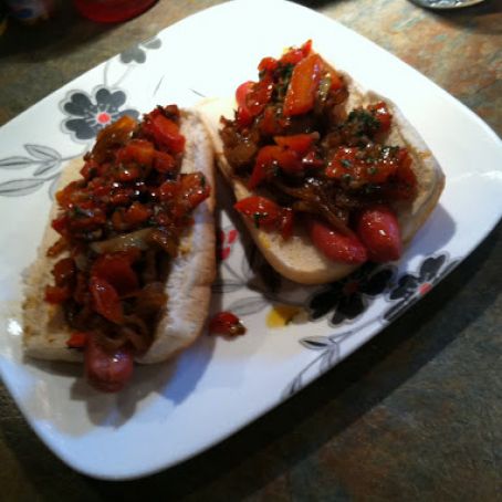 Hot Dogs w/ Onion Sauce & Grilled Red Pepper Relish