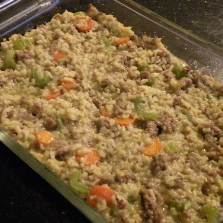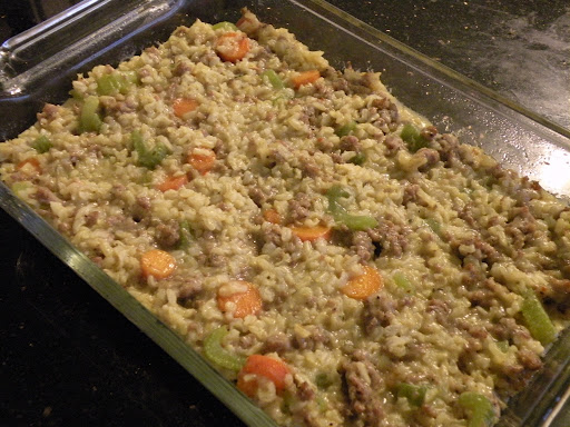 Brown and drain meat. Add Celery, Onion and Pepper and cook until tender. Stir in Soup, Milk, Rice and Seasonings. Pour into 9x13 baking pan. Bake at 350 degrees for 50 minutes, covered.