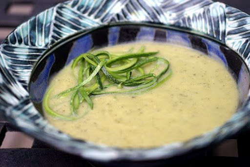 Bring remaining cup of water to boil in a saucepan and blanch julienned zucchini (1 minute). Drain in a sieve set over a bowl (use liquid to thin soup, if necessary). Season with salt and pepper. Serve with julienned zucchini mounded on top.
