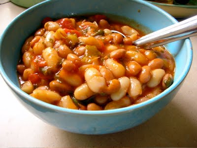 Place the beans in a wide, short saucepot (rondeau), and cover with water by 2 inches. Cook for 30 minutes, and then, add the tomatoes, onions, jalapeno, garlic, bay leaves, oregano, and beer. Cook until the beans are tender, about another 30 minutes.