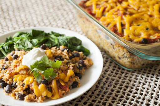 Toss quinoa with beans, cumin, chili powder, salt, and pepper. Spread 1/2 across the bottom of a 9 x 13-inch casserole pan. Top with an even layer of salsa, then a layer of cheddar. Repeat layering, ending with cheese on top.