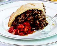 8 Pile meat mixture onto bottom pastry crust, leaving a 1-inch (2.5-cm) border. Brush edge of pastry with water. Top with remaining piece of pastry and press edges together to seal, crimping decoratively if desired.
