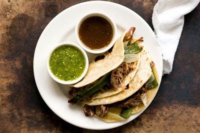 To make the tacos, place on one side of each tortilla some Monterey Jack and slide the tortillas under the broiler for 30 seconds or until the cheese is melted. Fill the tortillas with shredded brisket and top with some of the onions and poblano strips. Serve with the pot juices and salsa.