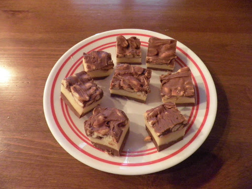 In large saucepan, over low heat, melt chocolate and butterscotch chips (I use the microwave). Remove from heat; stir in peanut butter. Mix well. Spread half of mixture in buttered (or line with parchment paper) 10 x 15 x 1 inch pan. Refrigerate. Stir peanuts into remaining mixture; set aside. In large saucepan, over low heat, melt margarine; slowly stir in evaporated milk. Stir in pudding mix; cook, stirring constantly until mixture is slightly thickened (do not boil). Remove from heat. Stir in powdered sugar and vanilla; cool slightly. Carefully spread mixture over chilled chocolate layer. Refrigerate 30 minutes. Drop reserved chocolate mixture by tablespoonfuls over chilled pudding layer; spread to cover. Chill until firm; cut into bars or squares. Cover tightly; refrigerate.