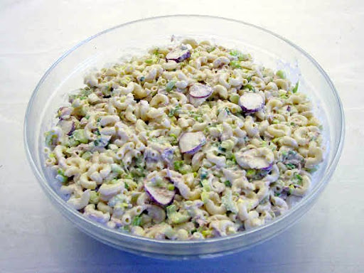 rinse macaroni until cold and add tuna, celery and garlic salt. Add mayo until moist. Put in fridge. Add more mayo.