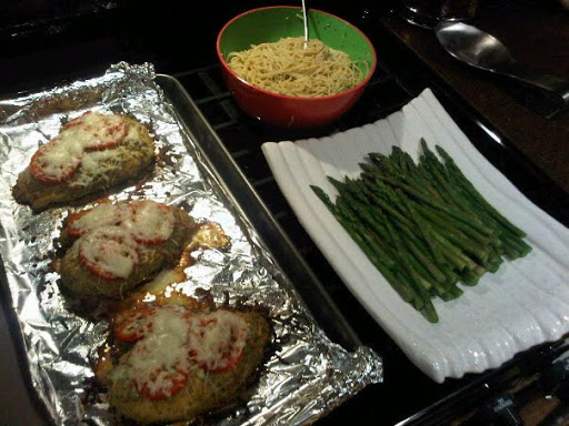 Put pesto in a small bowl. Add chicken breasts individually. Coat with pesto, then immediately roll in bread crumbs. Place breaded chicken on baking sheet.