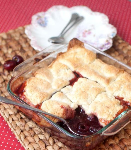 Pre-heat the oven to 375. In a medium bowl, stir together the cherries, honey, brown sugar, and cinnamon. Dissolve the cornstarch in the lemon juice and Kirsch, and stir into the cherry mixture. Mix thoroughly. Grease and 8×8 baking dish with soft butter. Pour the fruit mixture into the buttered pan. Dot the surface with the chilled butter.