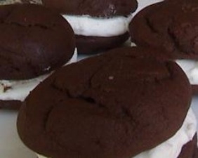 8. To assemble whoopie pies, pair cooled cookies by size. Place flat side of 8 cookies up and spread a generous amount of filling on each. Top with the matching-size cookie to make a sandwich.
