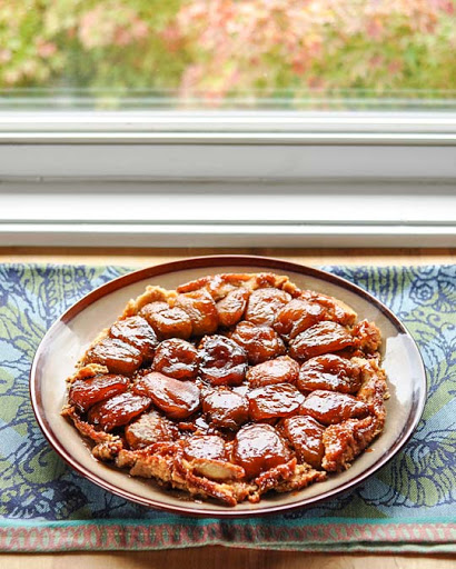 Be sure to run a knife around the edge of the crust and then get a firm grip on the plate-and-skillet sandwich before flipping. The tarte is still warm at this point, so it's easy to nudge any apples back into place that fall out of line or stick to the pan.