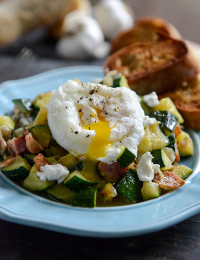 Zucchini Summer Skillet with Poached Eggs + Garlic Brown Butter Baguettes
