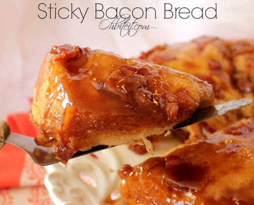 Layer each Biscuit in a circle around the pan, making sure to top each one with some Syrup, Sugar & Bacon! Really ‘goo’ that baby up, use every last drop of the Syrup and Sugar mixtures!