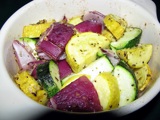 Cover the baking dish with foil and bake at 400 degrees for 20 minutes. Remove the foil and bake until the edges of the vegetables are golden, about 30-40 minutes.